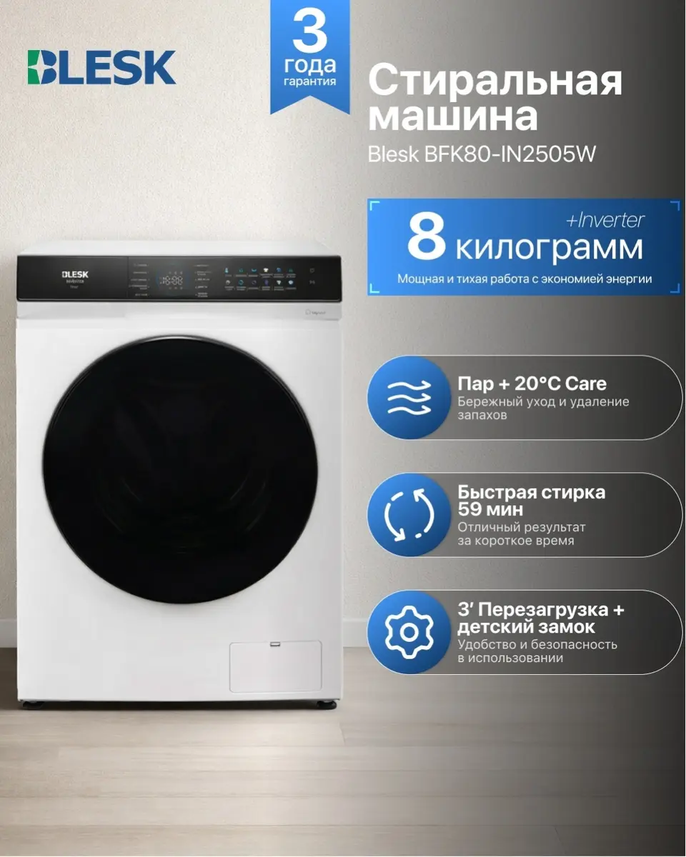 Программы-эко стирка, шерсть, отжим, полоскание, предварительная стирка, подача пара, быстрая стирка, деликатная стирка, ночной режим, очистка барабана