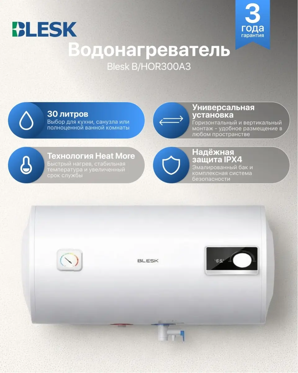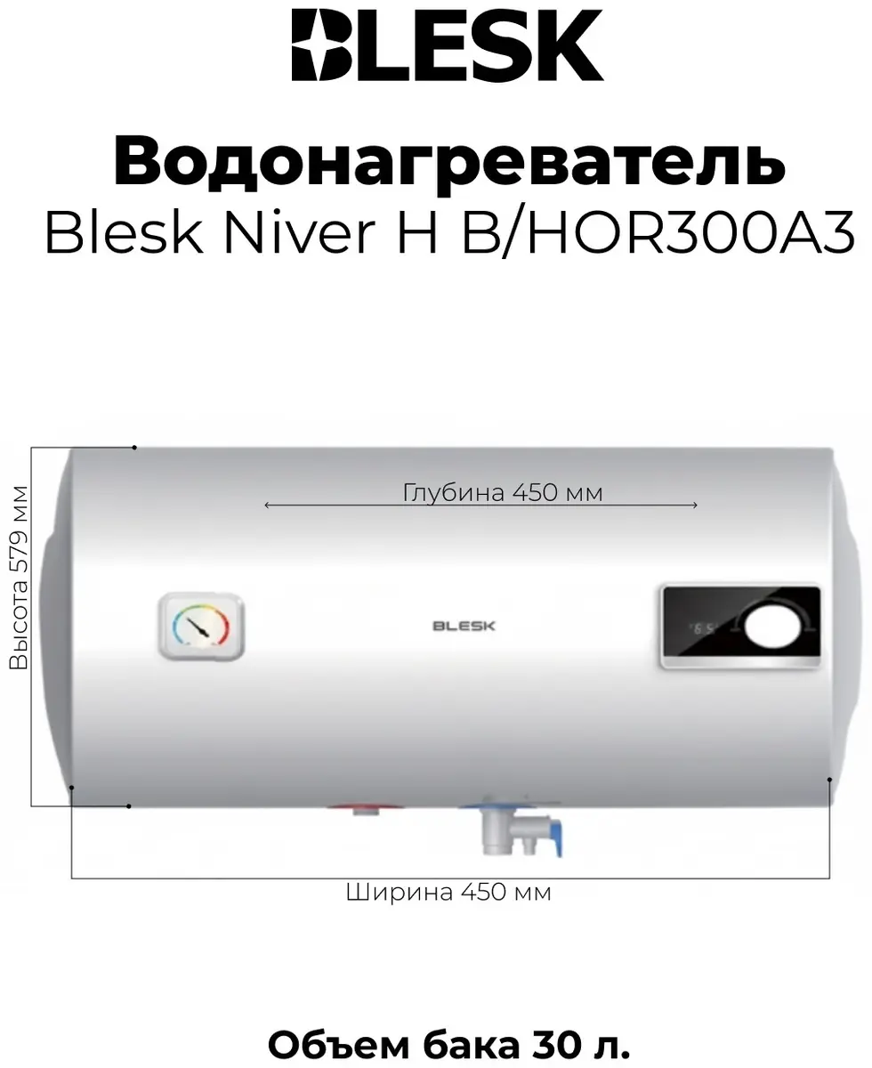 Водонагреватель Blesk Niver H B/HOR300A3 — компактное и удобное решение для стабильной подачи горячей воды в квартире, на кухне или в ванной комнате. Горизонтальная настенная установка позволяет рационально использовать пространство даже в небольших помещениях.